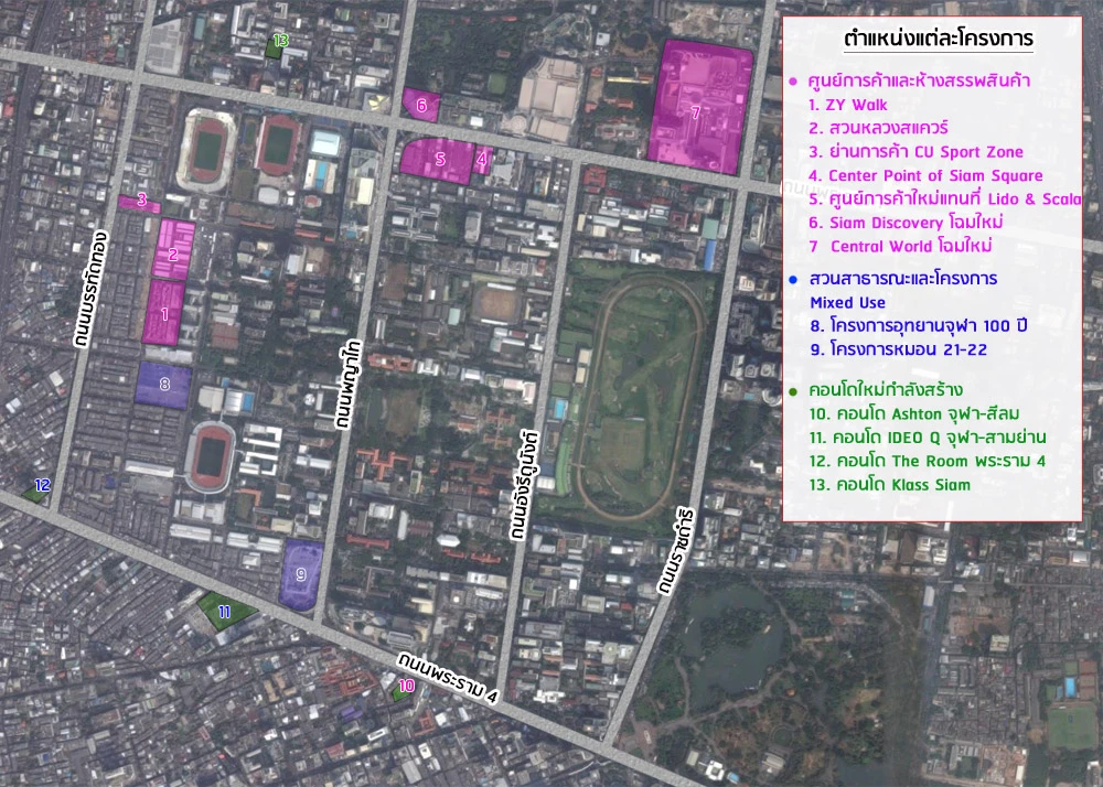 แผนที่แสดงตำแหน่งโครงการต่างๆ ที่จะทยอยเกิดขึ้นอีกเรื่อยๆ ในย่านสามย่าน - จุฬา - สยาม นี้