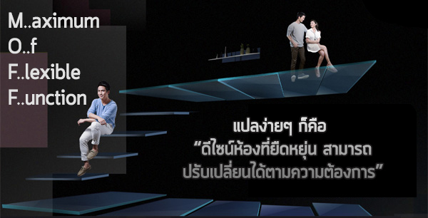 หลายท่านอาจจะสงสัยว่า MOFF Design คืออะไร MOFF Design มาจาก M=Maximum O=of F=Flexible F=Function ส่วนที่เป็น Maximum และ Flexible นั้น Property Perfect ได้ออกแบบให้เป็นห้องที่ยกสูงขึ้นไปอีกระดับ ทำให้มีความรู้สึกเหมือนอยู่บ้าน 2 ชั้นทั้งที่จริงๆ แล้วอยู่คอนโดค่ะ