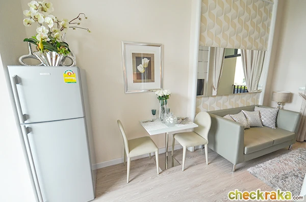 เข้ามาเจาะดูรายละเอียดกันบ้าง เข้ามาในห้องแล้วมองไปทางซ้ายมือทางโครงการจัดเป็นโซนรับประทานอาหารไว้ค่ะ วางชุดโต๊ะและเก้าอี้สำหรับ 2 ท่านเอาไว้ ชิดกับประตูมีพื้นที่สำหรับไว้วางตู้เย็น