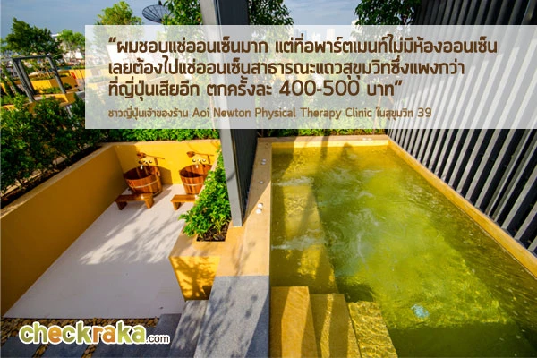 ปิดท้ายกันด้วยตัวอย่างคอนโดของจริงที่น่าสนใจสำหรับคนญี่ปุ่นสัก 1 โครงการในกรุงเทพฯค่ะ ซึ่งก็คือโครงการ Maestro 39 ตั้งอยู่ในซอยสุขุมวิท 39 ซึ่งมีจุดน่าสนใจหลักๆ เช่น ตกแต่งด้วยเฟอร์นิเจอร์ไม้สีอ่อนแบบเรียบๆ มีลานสำหรับแช่ Onsen ลอยฟ้า (ตามภาพด้านล่าง) มีสนามซ้อมกอล์ฟเล็กๆ และมีพื้นที่สำหรับเปลี่ยนรองเท้าก่อนเข้าสู่ตัวห้อง (Genkan) เหมือนบ้านสไตล์ญี่ปุ่น เป็นต้น
