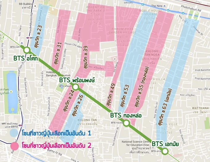 แน่นอนว่าในกรุงเทพฯ นั้นมีทำเลซึ่งเป็นที่นิยมสำหรับชาวต่างชาติอยู่หลายๆ ทำเล เช่น เพลินจิต สาทร และสุขุมวิท (ดูบทความ "ปล่อยเช่า-ขายคอนโด : ทำเลไหนตอบโจทย์ชาวต่างชาติ" ได้ที่นี่) แต่แน่นอนว่าสำหรับชาวญี่ปุ่นแล้ว ย่านที่นิยมเป็นอันดับหนึ่งคือ ย่านสุขุมวิท 24, 31, 39, 49 และ 55 ซึ่งถือเป็นโซนที่ชาวญี่ปุ่นเลือกเป็นอันดับแรก รองลงมาคือโซนสุขุมวิท 23, 26, 53, 60 และซอยเอกมัย