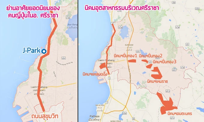 เหตุผลหลักๆ มี 2 อย่างค่ะ (ก) ศรีราชาเป็นเมืองท่าขนส่งสินค้าที่ใหญ่ที่สุดในเมืองไทย และมีนิคมอุตสาหกรรมที่มีบริษัทญี่ปุ่นมาเปิดโรงงานเป็นจำนวนมาก เด่นๆ เลยก็เช่น Toyota, Mitsubishi, Asahi ทั้งหมดนี้กระจัดกระจายกันอยู่ในนิคมอุตสาหกรรมในชลบุรีและพื้นที่ใกล้เคียง เช่น นิคมอุตสาหกรรมแหลมฉบัง เหมราช และอมตะนครในจังหวัดชลบุรี และนิคมอุตสาหกรรมมาบตาพุด จังหวัดระยอง แต่บริเวณที่ใกล้กับโรงงานมากๆ ชาวญี่ปุ่นไม่ชอบเพราะมีมลภาวะจากโรงงานอุตสาหกรรม ชาวญี่ปุ่นจึงนิยมอาศัยห่างจากนิคมอุตสาหกรรมต่างๆประมาณ 15-30 นาทีโดยการขับรถหรือนั่งรถบัสที่บริษัทตนเองมีบริการให้ และ (ข) ปัจจุบันศรีราชามีครบทุกอย่างสำหรับไลฟ์สไตล์ชาวญี่ปุ่นแล้ว เช่น ติดริมทะเล (คล้าย Yokohama) ร้านอาหารญี่ปุ่น และสนามกอล์ฟรายล้อมสำหรับการพักผ่อนในช่วงสุดสัปดาห์ของคนญี่ปุ่น
