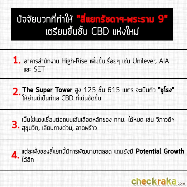 บริเวณแยกพระราม 9 ฝั่งที่ดูจะคึกคักและเป็นที่จับตามองที่สุด ก็คือ "ฝั่งเซ็นทรัลพระราม 9" ค่ะ เพราะเป็นทำเลที่กำลังจะกลายเป็นใจกลางย่านธุรกิจ ซึ่งตอนนี้กำลังมีการก่อสร้างอาคาร รวมถึง Landmark แห่งใหม่ของเมืองไทยอย่าง "The Super Tower" ในอดีตฝั่งนี้เป็นพื้นที่ว่างเปล่า หรือไม่ได้ใช้ประโยชน์ในเชิงพาณิชย์อย่างเต็มที่ แต่หลังจากเริ่มมี Central พระราม 9 ย่านนี้ก็เริ่ม "จุดติด" และปัจจุบันแผนการพัฒนาตรงนี้ก็เป็นรูปเป็นร่างขึ้นมาเรื่อยๆ แล้ว