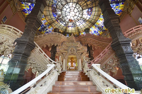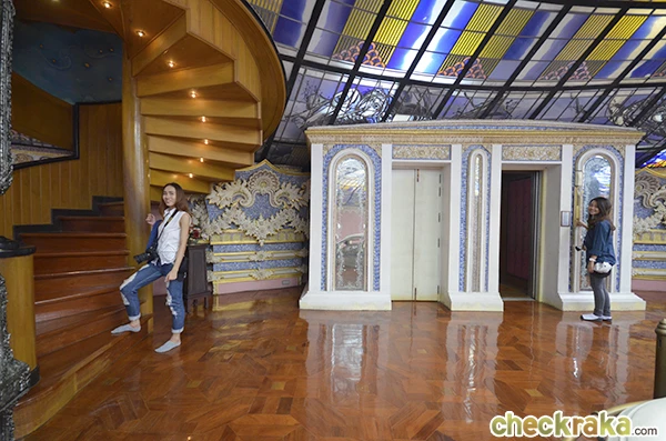 ส่วนเพดานประดับกระจกสี ออกแบบเป็นลวดลายแผนที่โลกจากฝีมือช่างเยอรมัน