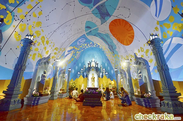 โดยเพดานเปรียบได้กับหลังคาโลก โดยมีศาสนาเป็นเครื่องค้ำจุนโลกไว้ สังเกตได้จากแผ่นดีบุกดุนลายที่ประดับอยู่บนเสาทั้ง 4 ต้น แต่ละต้นจะเป็นเรื่องราวของศาสนาพุทธ คริสต์ ฮินดู และพุทธนิกายมหายาน