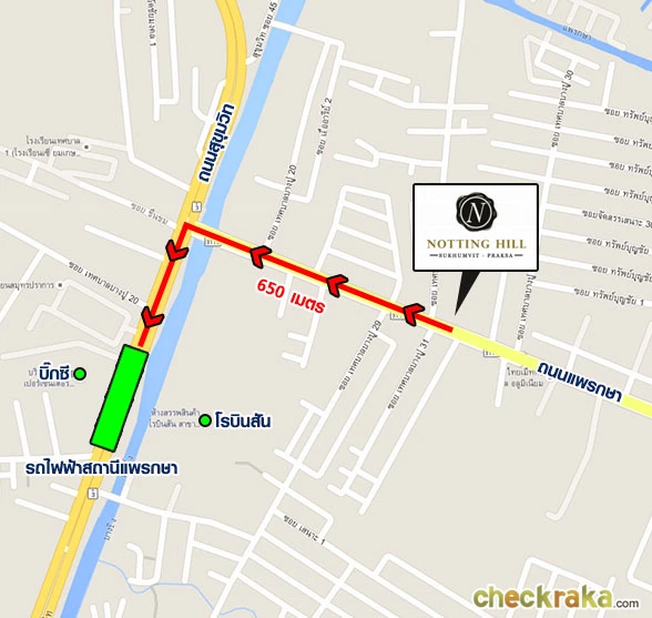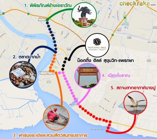 ได้ยินจากเพื่อนๆ มาว่าย่านสุขุมวิท-ปากน้ำ กำลังมีคอนโดใหม่เพิ่มขึ้นเรื่อยๆ พอดีคุณแม่มีญาติอยู่แถวนี้ท่านก็เลยอยากจะซื้อไว้อยู่ใกล้ๆ กันค่ะ วันนี้โอกาสเหมาะขอหนีงานมาดูเผื่อจะซื้อให้แม่สักหน่อย ที่เล็งๆ ไว้ก็เป็นโครงการ "น็อตติ้ง ฮิลล์ สุขุมวิท-แพรกษา" (Notting Hill Sukhumvit - Praksa) ของค่ายออริจิ้น (ORIGIN) ที่เป็นหนึ่งในค่ายใหญ่มีการพัฒนาหลายโครงการแล้วในแถวนี้ ไหนๆ ก็มาแถวนี้แล้วขอถือโอกาสนี้ไปเที่ยวด้วยซะเลย เรามาดูกันเลยค่ะว่า Checkraka จะไปเที่ยวที่ไหนและคอนโดที่เล็งไว้นี้อยู่ตรงไหนกันแน่ ตามมาเลย...