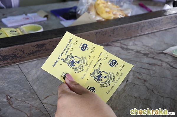 ตั๋วที่ได้มาอย่างเพิ่งขยำทิ้งนะคะ สามารถนำไปแลกพวงมาลัย ธูป 9 ดอก และดอกบัวสำหรับลอยน้ำได้ด้วย