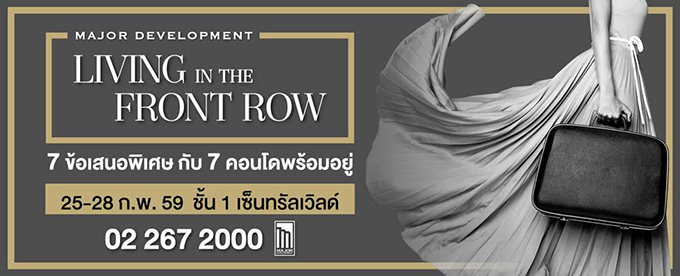 เร็วๆ นี้จะมีงานของค่าย Major Development คืองาน "Living in the Front Row by Major Development" วันที่ 25-28 กุมภาพันธ์ 2559 นี้ ที่ Central Court ชั้น 1 CentralWorld งานนี้จัดขึ้นเพื่อเอาใจคนชอบคอนโดพร้อมอยู่ เพราะทางเมเจอร์ฯ ได้นำคอนโดพร้อมอยู่ 7 โครงการ มาให้ผู้ที่สนใจได้เลือกจับจองกันเป็นเจ้าของ โดยทั้ง 7 โครงการมี ดังนี้