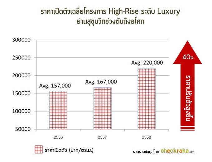 จากข้อมูลในตารางจะเห็นได้เลยว่าราคาเปิดตัวคอนโดหรูย่านนี้ราคาไม่เบาเลย ซึ่งแนวโน้มราคาคอนโดที่ขึ้นไปนี้ก็ไม่ใช่เรื่องแปลกค่ะ เพราะราคาที่ดินปัจจุบันแถวถนนใหญ่สุขุมวิทก็เริ่มต้นกันที่ 1.2-1.9 ล้านบาท/ตร.ว. กันเป็นอย่างต่ำหมดแล้ว หรือแม้กระทั่งในซอยอย่างทองหล่อก็เปิดราคาขายกันสูงถึง 1.9 ล้านบาท/ตร.ว. แล้ว และในปี 2559 นี้ ราคาประเมินที่ดินรอบใหม่ก็เริ่มมีผล โดยราคาประเมินที่ดินในพื้นที่กรุงเทพฯ ก็เพิ่มขึ้นเฉลี่ยถึง 15.78% ในขณะที่ปัจจุบันที่ดินเกาะแนวรถไฟฟ้าถนนสุขุมวิทมีการปรับตัวสูงกว่า 15-20% ต่อปี ทางทีมงานได้ทำกราฟแสดงราคาเปิดตัวเฉลี่ยของโครงการคอนโด High Rise ระดับ Luxury ในย่านสุขุมวิทมาให้ดูกันค่ะ