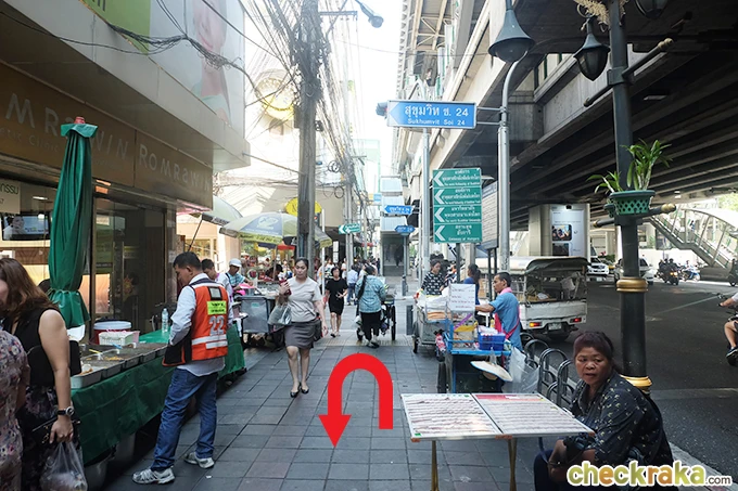 เมื่อลงมาจากทางออกที่ 4 จะเจอป้ายซอยสุขุมวิท 24 ให้เลี้ยวกลับเดินไปอีกฝั่งนึงค่ะ
