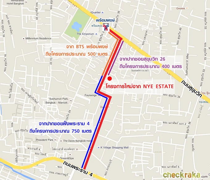 ซอยสุขุมวิท 26 จะอยู่ฝั่งเดียวกับห้าง Emporium ค่ะ สถานีรถไฟฟ้าที่ใกล้ที่สุดคือสถานีพร้อมพงษ์ (ห่างจากโครงการใหม่ของ Nye Estate ประมาณ 500 เมตรเท่านั้น) และซอยนี้ยังสามารถทะลุออกถนนพระราม 4 ได้อีกด้วย