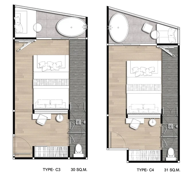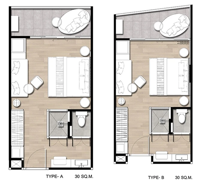 สำหรับแบบแปลนห้องนั้นจะมี 6 Type ด้วยกันค่ะ โดยทั้งหมดจะเป็นห้องแบบ Studio แบ่งเป็นห้อง Bay View (วิวชายหาดบางเสร่และหาดจอมเทียน) และ Bay Front ขนาดตั้งแต่ 30 ตร.ม. - 33 ตร.ม.