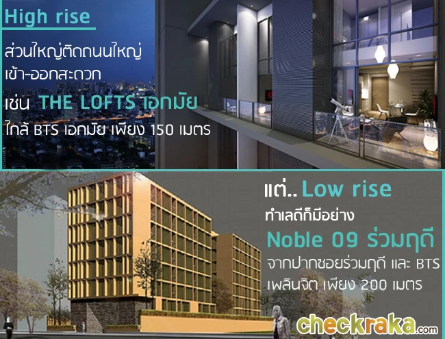 เหตุผลที่เรารวบรวมมาทั้งหมดนั้น เป็นภาพรวมแบบกว้างๆ ที่โดดเด่นของทั้งคอนโดแบบ High rise และ Low rise ซึ่งก็มีทั้งข้อเด่นและข้อด้อยตามลักษณะของโครงการแตกต่างกันไป แต่ก็มีข้อยกเว้นบ้างสำหรับโครงการคอนโดเทพๆ บางแห่งที่อาจจะออกแบบได้ฉีกกฎ หรือมีแผนการตลาดเฉพาะ อย่างเช่นคอนโด High rise ที่ดูแล้วน่าจะมีผู้อาศัยเยอะจนทำให้ด้อยในเรื่องมีความเป็นส่วนตัวน้อย แต่ถ้าเจ้าของโครงการเน้นทำตลาดให้มีจุดขายที่เน้นความเป็นส่วนตัวแล้วออกแบบให้มียูนิตน้อย ข้อด้อยเรื่องนี้ก็คงได้รับการยกเว้น หรืออย่างคอนโด Low rise ทำเลเทพที่ถึงอยู่ในซอยย่อยแต่ก็มีทางลัด เดินทะลุเข้าหลังห้างได้สวยๆ แล้วเดินต่อเข้าสถานีรถไฟฟ้าได้เลย แบบนี้ก็คงต้องถือว่าคอนโดทำเลดีที่คอนโด high rise ติดถนนใหญ่คงต้องอาย ดังนั้นจะให้ดีเพื่อนๆ ที่ตัดสินใจซื้อคอนโดไม่ว่าจะเพื่ออยู่อาศัย หรือลงทุนก็ต้องพิจารณาข้อดี ข้อเสียของแต่ละโครงการด้วยการหาข้อมูล และทำการบ้านให้ดี จะได้เป็นเจ้าของห้องชุดที่มีศักยภาพ เหมาะสมกับการเป็นทรัพย์สินที่เป็น passive income ให้เราในอนาคตนะคะ