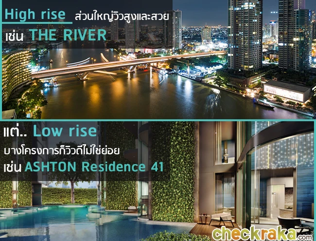 ข้อนี้ต้องถือว่าคอนโดแบบ High rise ส่วนใหญ่จะชนะคอนโด Low rise เพราะความได้เปรียบของการเป็นอาคารสูงทำให้สามารถมองเห็นวิวจากชั้นที่สูงกว่า และมีโอกาสที่อาคารข้างๆ จะบังวิวก็น้อยกว่าคอนโดเตี้ย นอกจากนี้แล้วส่วนใหญ่คอนโดสูงมักมีชื่อ มีจุดขาย หรือจุดเด่นเรื่องวิวเจ๋งๆ อย่างการเป็นคอนโดวิวทะเล วิวแม่น้ำ หรือวิวเมืองแบบเทพๆ เพราะวิวดีๆ ย่อมต้องแลกมาด้วยราคาต้นทุนของที่ดินที่มีมูลค่าสูง ซึ่งแน่นอนการพัฒนาที่ดินที่มีต้นทุนสูงให้ได้กำไรและความคุ้มค่าที่สุด เจ้าของโครงการก็ต้องมุ่งการลงทุนไปเลือกสร้างโครงการคอนโดสูงแบบ High rise มากกว่าพัฒนาโครงการเป็นคอนโดแบบ Low rise แน่นอนค่ะ