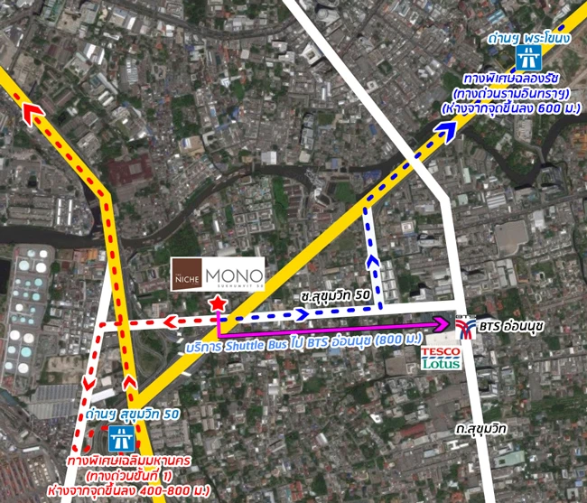 รถไฟฟ้า BTS สถานีอ่อนนุช ห่างจากโครงการประมาณ 800 เมตร โดยมีรถ Shuttle Bus บริการจากโครงการ