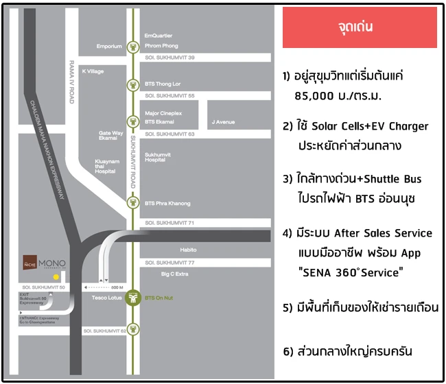 "Location Edit: บนทำเลเด่นซอยสุขุมวิท 50" กับทำเลที่ใกล้กับ 1) ทางด่วน 2) ใกล้แหล่ง Shopping & Lifestyle และ 3) ใกล้รถไฟฟ้า BTS สถานีอ่อนนุช พร้อมรถ Shuttle Bus จากโครงการ ในส่วนของตัวโครงการนั้นอยู่ภายในซอยสุขุมวิท 50 สามารถเดินทางได้สะดวกโดยเฉพาะรถยนต์ส่วนตัวที่อยู่ใกล้กับจุดขึ้นลงทางด่วนถึงสองจุด นอกจากนี้ยังมีรถไฟฟ้า BTS สถานีอ่อนนุช ที่มีบริการ Shuttle Bus จากโครงการไปยังสถานี ทำให้เข้าถึงแหล่ง Shopping & Lifestyle ในย่านสุขุมวิทอย่างพร้อมพงษ์, เอกมัย, ทองหล่อ และอโศก ได้สะดวกรวดเร็ว