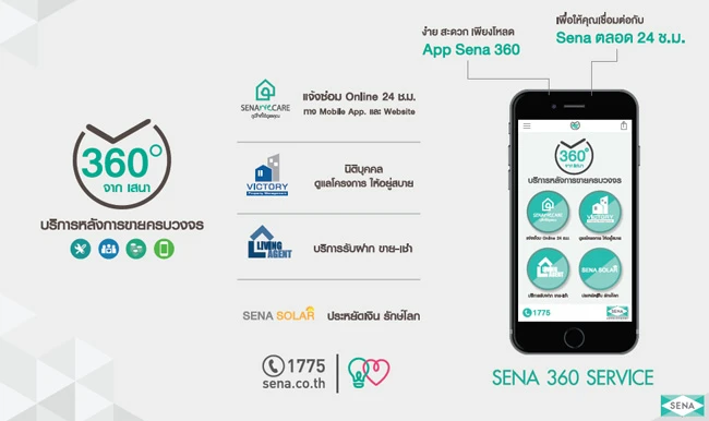 เสนาฯ มีบริการหลังการขายแบบ 360 องศา ที่สร้างขึ้นมาจากปรัชญาองค์กร "ความไว้วางใจจากลูกค้า คือความภูมิใจของเรา" ซึ่งทางเสนาฯ ได้ให้ความสำคัญกับการบริการหลังการขายอย่างมาก ตั้งแต่วันแรกที่ลูกค้าซื้อบ้านหรือคอนโดของเสนา จนถึงวันที่ลูกค้าจะขายบ้านหรือคอนโดให้คนอื่น โดยลูกค้าจะได้รับการบริการหลังการขายเป็นอย่างดีจากทีมงานที่มีประสบการณ์ และเพื่อให้ตอบสนองกับการใช้ชีวิตของคนยุคปัจจุบัน ทางเสนาฯ จึงคิดค้นและพัฒนา Mobile App ชื่อ SENA 360⁰ Service ที่รวบรวมทุกช่องทางในการติดต่อสื่อสารระหว่างบริษัทและลูกค้า เพื่ออำนวยความสะดวกและตอบโจทย์ไลฟ์สไตล์ของลูกค้า ซึ่งเป็น Add-on ในส่วนของ After Sales Service ที่ทางเสนาฯ ตั้งใจมอบให้ลูกค้าโดยไม่ได้ทำเพื่อผลกำไร โดยตั้งทีมงาน Division ที่ทำเกี่ยวกับ 360⁰ Service ไว้โดยตรงเลยค่ะ