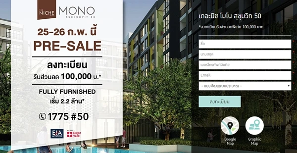 เรียกได้ว่าเป็นคอนโดใหม่ที่น่าจับตาอีกโครงการนึงนะคะ กับ The Niche Mono Sukhumvit 50 ในราคาที่เริ่มต้นเพียง 2 ล้านต้นๆ เท่านั้น แถมยังเป็นคอนโด Fully Furnished บน Location ที่สามารถย่นระยะการเดินทางสู่แหล่ง Life Style ในย่านสุขุมวิท, อ่อนนุช, ทองหล่อ และพร้อมพงษ์ ได้สะดวก สำหรับผู้ที่สนใจโครงการนี้ สามารถลงทะเบียนเพื่อรับส่วนลด 100,000 บาท ได้ลิงก์ด้านล่างนี้ โดยโครงการจะเปิด Pre-Sale ในวันที่ 25 - 26 ก.พ. 2560 นี้ด้วยค่ะ หากท่านใดสนใจก็สามารถไปเยี่ยมชมได้ที่ Sales Gallery นะคะ ซึ่งมีตัวอย่าง Sollar Cells และ EV Charger ให้ชมด้วยค่ะ