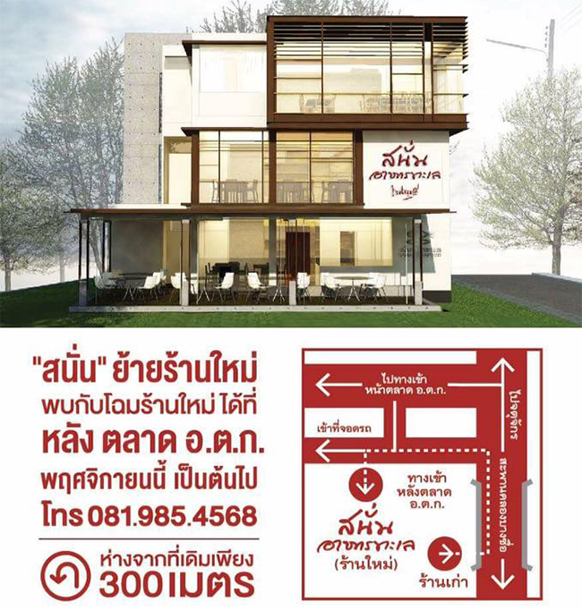 ปัจจุบันร้านสนั่นอาหารทะเลย้ายไปยังที่ตั้งใหม่อยู่บริเวณตรงข้ามป้อมยามทางเข้าที่จอดรถหลังตลาด อ.ต.ก.