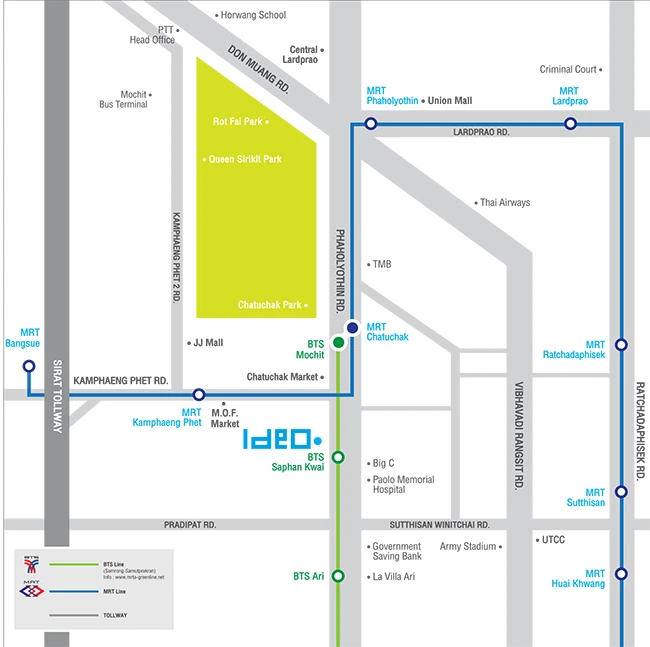โครงการนี้ตั้งอยู่ในจุดที่ใกล้ทั้งรถไฟฟ้า BTS และรถใต้ดิน MRT ในระยะที่สามารถเดินถึงได้จริง ซึ่งที่ผ่านมาหลายๆ คอนโดที่เปิดแถวนี้จะกระจุกตัวอยู่แถว BTS สะพานควาย และค่อนข้างไกลจาก MRT แต่โครงการนี้ตั้งอยู่ในระยะเดินไปรถไฟฟ้าบนดิน (BTS) และใต้ดิน (MRT) ได้เลย โดยทำเลของโครงการ “Ideo พหลโยธิน-จตุจักร” จะตั้งอยู่เยื้องมาทาง BTS สถานีสะพานควาย ช่วงก่อนถึงแยกกำแพงเพชร มีระยะห่างจากโครงการไป BTS สะพานควายอยู่ที่ 150 เมตร ส่วนระยะห่างจากโครงการเดินไปที่ MRT กำแพงเพชร อยู่ที่ 500 เมตร นอกจากนี้ที่ดินแปลงนี้ยังมีจุดเด่นตรงที่เป็นที่ดินติดถนนใหญ่แปลงสุดท้ายของโซน เพราะรอบๆ เป็นที่ของทางราชการเกือบหมด โครงการนี้เลยไม่ต้องห่วงเรื่องโดนบล็อควิวในระยะประชิดจากตึกสูงสร้างใหม่ด้วย