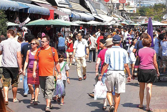 ภาพบรรยากาศของตลาดนัดสวนจตุจักรที่เต็มไปด้วยนักช้อปทั้งไทยและต่างชาติ