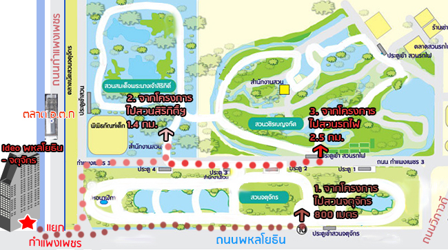 แผนที่แสดงระยะห่างจากโครงการ "Ideo พหลโยธิน-จตุจักร" ไปยัง 3 สวนสาธารณะใกล้เคียง