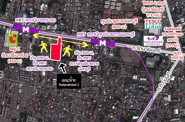 โครงการ แอสปาย รัตนาธิเบศร์ 2 (Aspire Rattanatibet 2) ตั้งอยู่บนถนนรัตนาธิเบศร์ ช่วงระหว่างรถไฟฟ้าสายสีม่วง สถานีบางกระสอ (ห่างจากโครงการ 200 ม.) และสถานีศูนย์ราชการนนทบุรี (ห่างจากโครงการ 300 ม.) ค่ะ แม้ว่าโครงการนี้จะขยับออกมาจากใจกลางเมืองหน่อย แต่เดินทางได้สะดวกด้วยรถไฟฟ้าสายสีม่วงในระยะที่สามารถเดินได้ มีทางด่วนขั้นที่ 2 ตรงถนนงามวงศ์วานที่อยู่ไม่ไกล ในแง่ของทำเลที่อยู่อาศัยในการใช้ชีวิตถือว่าดีทีเดียวเลยนะคะ เนื่องจากปัจจุบันโซนรัตนาธิเบศร์โซนนี้มีสิ่งอำนวยความสะดวกอยู่รอบด้าน มีห้างสรรพสินค้าอยู่รอบๆ โครงการ ไม่ว่าจะเป็น เซ็นทรัล รัตนาธิเบศร์, Esplanade แคราย หรือ Big C รัตนาธิเบศร์ 2 ซึ่งอยู่ห่างจากโครงการเพียง 450 ม. เท่านั้น สามารถเดินไปได้เลยค่ะ
