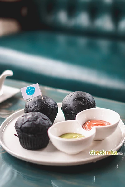 ช่วงนี้ชาโคลมาแรงมากๆ ที่นี่ก็ไม่พลาดค่ะ ขนมปังชาโคลพร้อมดิปสังขยาและชาไทย