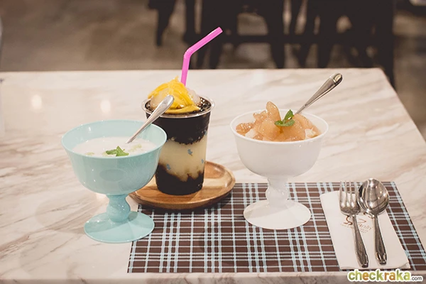 3 ทหารเสือ ขนมไทยๆ 3 อย่างที่เราอยากแนะนำค่ะ ที่อยู่ในแก้วดำๆ นั่่นไม่ใช่อะไร คือเฉาก๊วยปั่นพร้อมท็อปปิ้งขนุนนั่นเอง อร่อยมากกกก ก (ก. ไก่ ล้านตัว) ถ้วยสีขาวคือ ลูกตาลลอยแก้ว อร่อยเหมือนกัน ส่วนถ้วยสีฟ้าคือ ข้าวฟ่างมะพร้าวอ่อน หอมกะทิมาก ก. ไก่ล้านตัวเช่นเดียวกันค่ะ ทานอุ่นๆ ในช่วงที่อากาศเย็นๆ นี่ฟินสุดๆ