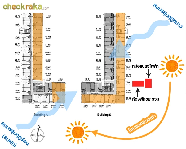 อีกปัจจัยหนึ่งที่สำคัญของการอยู่อาศัยคอนโดก็คือทิศทางของลมและแสงแดดค่ะ เพราะคอนโดเป็นเพียงห้องสี่เหลี่ยมต้องเลือกห้องที่ลมพัดผ่านและแสงแดดเข้าถึงบ้าง ซึ่งห้องที่ตรงตามความต้องการนี้ก็อาจจะแลกด้วยราคาที่สูงขึ้นมาสักนิด อันนี้ก็ต้องพิจารณากันต่อไป ส่วนห้องที่อยู่ใกล้ลิฟต์ ใกล้ห้องพักขยะ หรือหม้อแปลงไฟฟ้าก็จะมีราคาที่ถูกลงกว่าห้องอื่นๆ Checkraka ได้ลองประเมินทิศทางลมและแสงแดด มาดูกันว่าห้องของโครงการ Poly Place Condo @ Phaholyothin 23 มีห้องไหนบ้างที่โดนแดดช่วงเช้า-บ่ายค่ะ