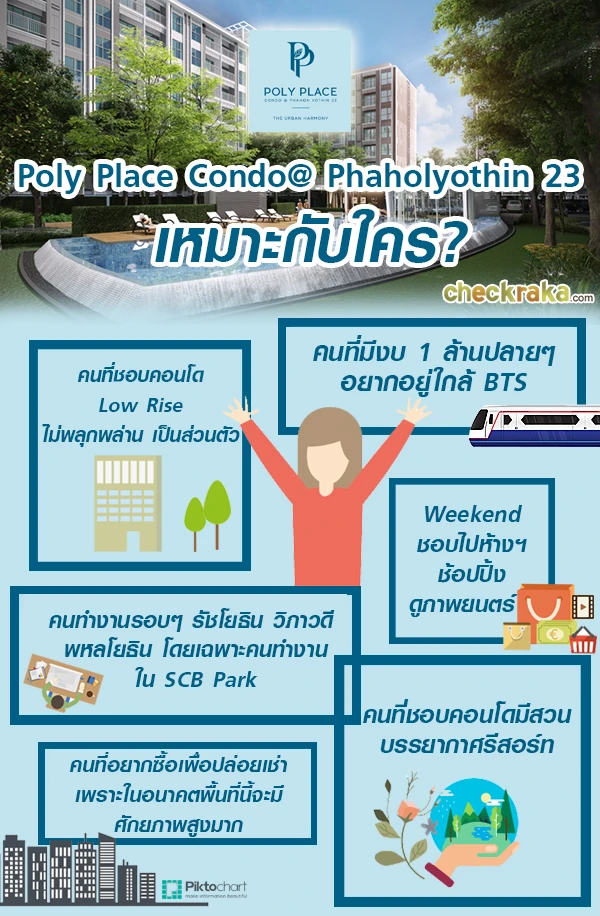 โพลี เพลส คอนโด แอท พหลโยธิน 23 (Poly Place Condo @ Phahon Yothin 23) เป็นโครงการที่มาพร้อมด้วยสิ่งอำนวยความสะดวกครบครัน เหมาะสำหรับการพักผ่อนหลังจากทำงานมาเหนื่อยๆ ได้กลับมาเจอสวนสวยๆ มีพื้นที่สีเขียวขนาดใหญ่กว่าใครๆ ในละแวกนี้ แถมเดินทางสะดวกเพราะรถไฟฟ้าอยู่หน้าปากซอยพหลโยธิน 23 จะนั่งวินมอเตอร์ไซค์เข้าไปต่อหรือจะเดินชิลล์ก็ได้ ยิ่งถ้าทำงานอยู่ในละแวกนี้ก็ยิ่งสะดวกมากๆ ค่ะ แต่ถ้าหากใครที่อยากซื้อเพื่อการลงทุนก็เหมาะเช่นเดียวกัน เพราะทำเลที่ตั้งของโครงการนั้นอยู่ใกล้กับมหาวิทยาลัยชั้นนำ ไม่ว่าจะเป็นมหาวิทยาลัยเกษตรศาสตร์ มหาวิทยาลัยราชภัฏจันทรเกษม มหาวิทยาลัยศรีปทุม และพนักงานที่ทำงานอยู่ใน SCB Park กว่า 8,000 คน ซึ่งสามารถเดินจากพื้นที่สำนักงานมายังโครงการได้เลย (ในวันและเวลาที่อาคารทำการ) หรือจะเป็นสำนักงานใหญ่ๆ ก็มีอยู่ในบริเวณนี้อีกหลายที่ ทำให้ปล่อยเช่าได้ง่ายขึ้น แถมราคาก็ไม่ได้แพงมากอีกด้วยเริ่มต้นเพียง 1.8 ล้านเท่านั้น ต้องบอกว่าราคานี้เป็นราคาก่อน Pre-sales 4-5 มีนาคม 2560 นี้เท่านั้นนะคะ สามารถลงทะเบียนรับข้อมูลเพิ่มเติม และส่วนลด 1 แสนบาทได้ที่ลิงก์ด้านล่างนี้ค่ะ