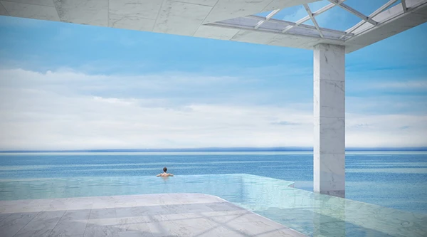 สระว่ายน้ำวิวพาโนราม่า ขอบสระว่ายน้ำจรดทะเลและท้องฟ้า ที่มาของชื่อโครงการ Bluphere
