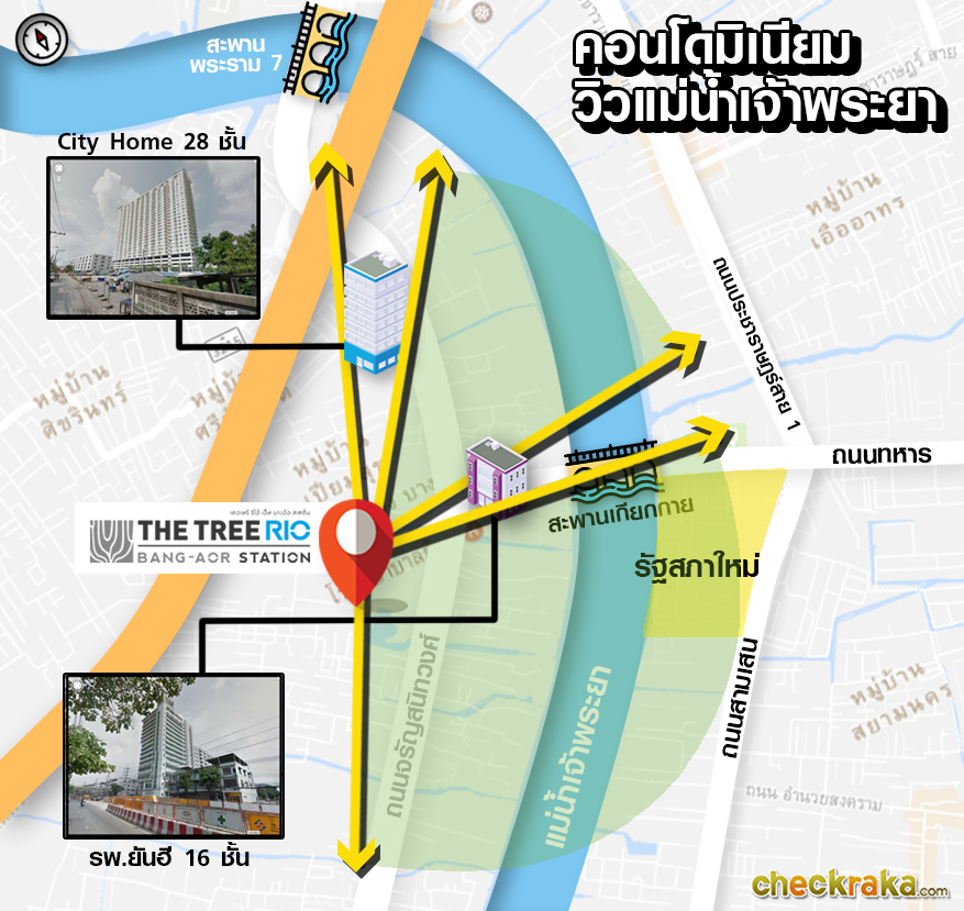ระยะห่างประมาณจาก The Tree Rio บางอ้อ สเตชั่น ถึงแม่น้ำเจ้าพระยา 800 เมตร สภาพแวดล้อมรอบๆ โครงการส่วนใหญ่เป็นชุมชน บ้านพักอาศัย และอาคารพาณิชย์ที่ตั้งเลียบไปตามถนนเส้นหลักอย่างจรัญสนิทวงศ์ มีตึกสูงตั้งอยู่บ้าง แต่ยังไม่หนาแน่นเท่าไหร่นัก มีเพียงอาคาร City Home สูง 28 ชั้น และโรงพยาบาลยันฮี ที่สูง 16 ชั้น แต่ก็ไม่ถึงกับเป็นปัญหา ทำให้มองเห็นวิวโค้งน้ำเจ้าพระยา สะพานเกียกกาย และรัฐสภาแห่งใหม่ ที่สวยงามได้อย่างเต็มที่