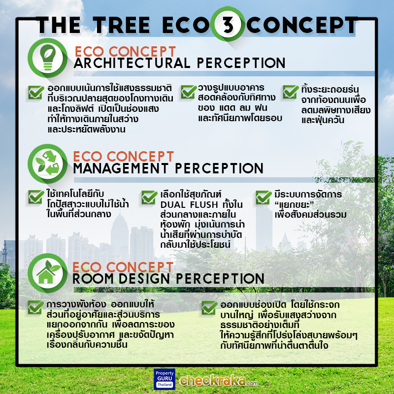 Eco 3 Concept คือ Concept ของแบรนด์ "The Tree" ที่ให้ความสำคัญกับสิ่งแวดล้อมและใส่ใจความต้องการของผู้อยู่อาศัย โดยการออกแบบที่เรียกว่าใส่ใจทุกรายละเอียด นำเทคโนโลยีสมัยใหม่มาใช้ช่วยประหยัดน้ำ ประหยัดไฟ และสร้างพื้นที่พักอาศัยให้เต็มไปด้วยต้นไม้ เพิ่มพื้นที่สีเขียว สร้างความผ่อนคลายให้กับผู้อยู่อาศัยอย่างเต็มที่