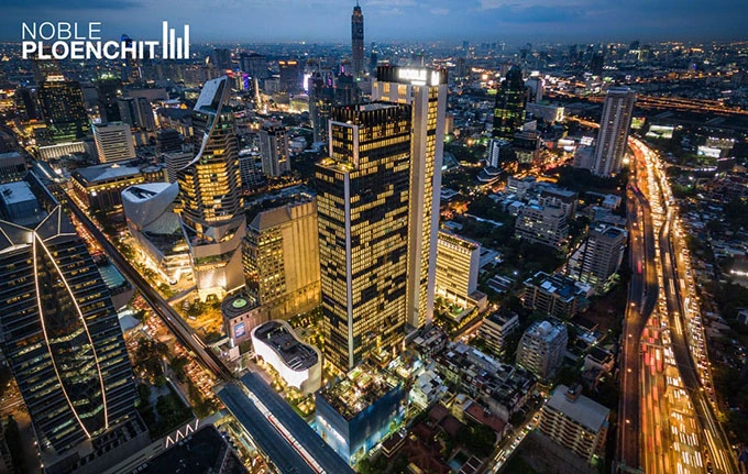 บรรยากาศยามค่ำคืนของ Noble Ploenchit ที่มีฉากหลังเป็นตึกใบหยก 2