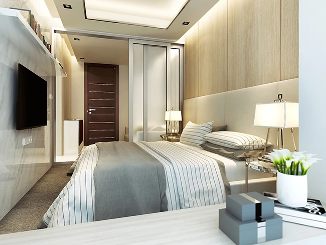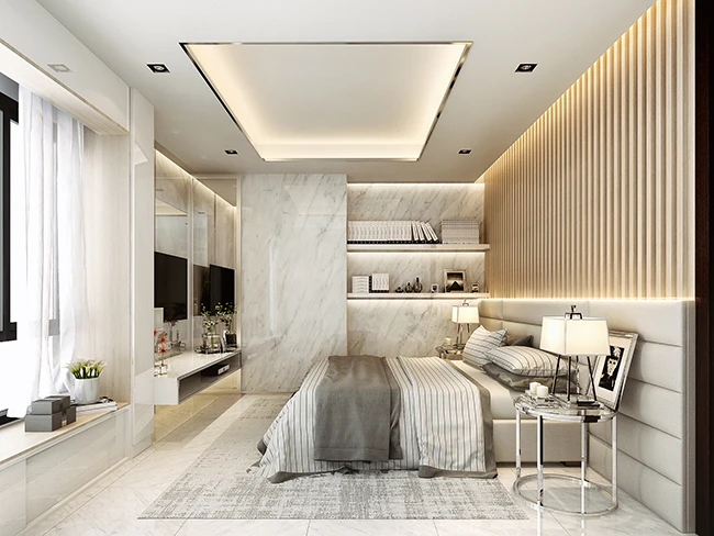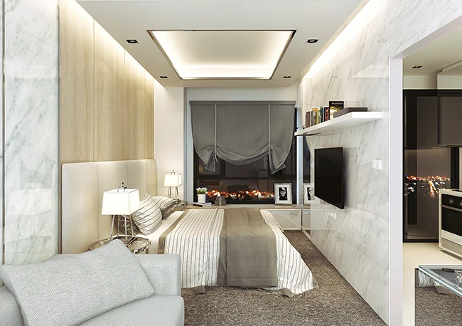 ภาพจำลอง ภายในห้องนอนที่ดูโปร่งโล่งผ่อนคลายกว่าด้วยความสูงจากพื้นจรดฝ้าเพดานถึง 2.7 เมตร