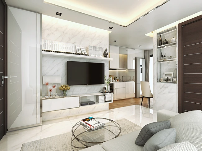 ภาพจำลอง พื้นที่ส่วนห้องรับแขกที่ตกแต่งด้วยเฟอร์นิเจอร์ Built in เรียบหรูดูสวยงาม