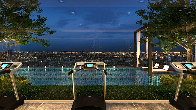 ภาพจำลองบรรยากาศฟิตเนสพร้อมอุปกรณ์ครบครันที่ให้คุณออกกำลังกายได้อย่างเพลิดเพลินไปกับวิวเมืองจากชั้นสูง