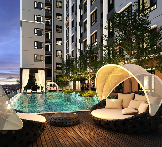 ภาพจำลองสระว่ายน้ำระบบเกลือพร้อมพื้นที่นั่งชิลไปกับบรรยากาศโปร่งโล่งในมุมสูง