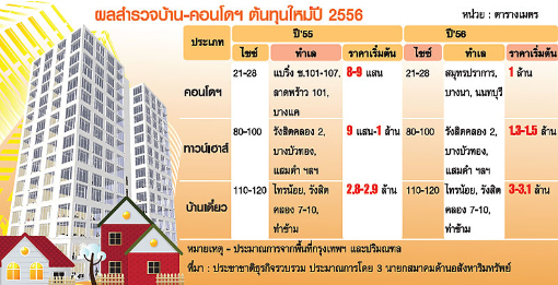 ย่างเข้าสู่ปี 2556 (ปีงูเล็ก) "ต้นทุน" ยังคงเป็นปัจจัยหลักที่กดดันให้ราคาที่อยู่อาศัยมีแนวโน้มปรับสูงขึ้น ตัวแปรมี 2 เรื่องหลัก คือ 1) ต้นทุนค่าก่อสร้าง ประกอบด้วย ค่าแรง-ค่าบริหารจัดการ และราคาวัสดุที่ปรับสูงขึ้น 2) ต้นทุนที่ดิน โดยเฉพาะทำเลแนวรถไฟฟ้าที่กำลังก่อสร้างที่ปรับขึ้นรวดเร็ว โดยที่ผ่านมาราคาบ้าน-คอนโดมิเนียมปรับขึ้นเฉลี่ยปีละ 5% บวกลบ แล้วแต่ความสามารถในการควบคุมต้นทุนของผู้ประกอบการ จากการสำรวจความคิด เห็นจาก 3 นายกสมาคมด้านอสังหาริมทรัพย์ ประกอบด้วย นายกสมาคมธุรกิจบ้านจัดสรร นายกสมาคมอสังหาริมทรัพย์ไทย และนายกสมาคมอาคารชุดไทย ทุกคนวิเคราะห์สรุปออกมาตรงกันว่าราคาของทาวน์เฮาส์ บ้านเดี่ยว และคอนโดฯ อยู่ในช่วงขาขึ้นทุกตัว ทาวน์เฮาส์พุ่ง 1.3-1.5 ล้าน นายอิสระ บุญยัง นายกสมาคมธุรกิจบ้านจัดสรร เปิดเผย "ประชาชาติธุรกิจ" ว่า สำหรับตลาดทาวน์เฮาส์แนวโน้มมี 3 ปัจจัยที่มีผลต่อต้นทุนการพัฒนาโครงการในปี 2556 คือ 1) ราคาที่ดินที่ปรับขึ้นตามการประกาศใช้ราคาประเมินใหม่ของกรมธนารักษ์เมื่อ กลางปี 2555 2) ต้นทุนค่าก่อสร้าง ค่าถมดิน ค่าสาธารณูปโภคในโครงการปรับตัวสูงขึ้น 3) ค่าจ้างผู้รับเหมาที่ปรับสูงขึ้นเนื่องจากแรงงานก่อสร้างขาดแคลน จะทำให้ทาวน์เฮาส์มีราคาขายสูงขึ้น เปรียบเทียบปี 2555 ในพื้นที่กรุงเทพฯรอบนอกและปริมณฑล อาทิ ตั้งแต่รังสิต คลอง 2 เป็นต้นไป คลองหลวง บางบัวทอง สมุทรสาคร ฯลฯ ยังพอพัฒนาทาวน์เฮาส์ที่มีราคาขายเริ่มต้น 1 ล้านบาท บวกลบได้ โดยจะได้พื้นที่ใช้สอยประมาณ 80-100 ตารางเมตร บนที่ดิน 16-18 ตารางวา ขณะที่แนวโน้มราคาทาวน์เฮาส์ในทำเลเดิมที่เปิดตัวใหม่ในปี 2556 คาดการร์ว่าน่าจะต้องเริ่มต้นที่ยูนิตละ 1.3-1.5 ล้านบวกลบ โดยยังคงได้พื้นที่ใช้สอยและที่ดินใกล้เคียงของเดิม เนื่องจากการพัฒนาทาวน์เฮาส์ 2 ห้องนอน สามารถพัฒนาพื้นที่ใช้สอยได้เล็กที่สุดประมาณ 70 ตารางเมตร หรือชั้นละประมาณ 35 ตารางเมตร ส่วนขนาดที่ดินถูกบังคับโดยกฎหมายว่าจะต้องมีที่ดินเริ่มต้น 16 ตารางวา "คิดว่าค่อนข้างยาก ถ้าจะพัฒนาทาวน์เฮาส์โดยใช้วิธีลดขนาดพื้นที่ใช้สอย ปรับสเป็กวัสดุ เพื่อให้ขายราคาเริ่มต้น 1 ล้านบาทเท่าเดิม เพราะต้นทุนค่าก่อสร้างบ้าน 2 ชั้น 70 ตารางเมตร กับ 80 ตารางเมตร ไม่ได้แตกต่างกันมากนัก" นายอิสระกล่าว บ้านเดี่ยวสตาร์ต 3 ล้านอัพ นายกิตติพล ปราโมช ณ อยุธยา นายกสมาคมอสังหาริมทรัพย์ไทย กล่าวกับ "ประชาชาติธุรกิจ" ว่า ตลาดบ้านเดี่ยวถือว่ามีต้นทุนพัฒนาโครงการเพิ่มขึ้นเช่นเดียวกัน เปรียบเทียบปี 2555 หากเป็นทำเลจังหวัดปริมณฑล เช่น ปทุมธานี