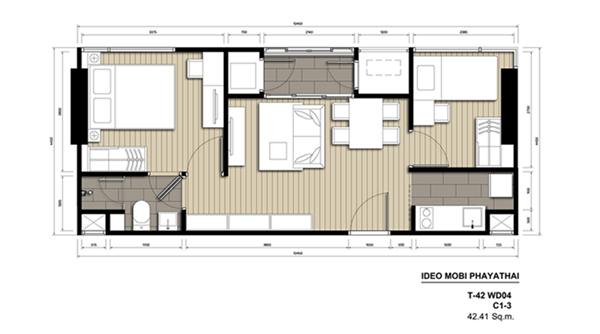 มาดูแปลนห้อง 2 ห้องนอนกันบ้างครับ คือแปลนห้อง 2 ห้องนอนของ "ไอดีโอ โมบิ พญาไท" (IDEO Mobi Phayathai) ที่มีขนาดเพียง 42.41 ตร.ม. ซึ่งเรียกได้ว่าแทบจะเป็น 2 ห้องนอนที่มีขนาดเล็กที่สุดในตลาดแล้ว แต่ก็สามารถจัดส่วนทุกอย่างได้อย่างลงตัว น่าสนใจไม่น้อยสำหรับผู้ที่ต้องการคอนโด 2 ห้องนอนที่ทำเลดี และราคาไม่สูง (เนื่องจากขนาดห้องไม่ใหญ่มาก)