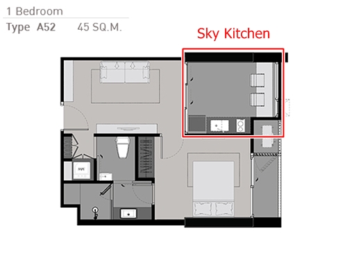 แปลนห้องนี้จะมีอยู่ในคอนโด "ริทึ่ม คอนโด" (RHYTHM Condo) ในทุกๆ ทำเล โดดเด่นด้วยห้องรูปแบบ Sky Kitchen ที่นำส่วนครัว และ Counter ทานอาหารพร้อมเก้าอี้สูง (Stool) อยู่ริมกระจกขนาดใหญ่ สามารถรับชมวิวมุมสูง และรับประทานอาหารได้พร้อมๆกัน
