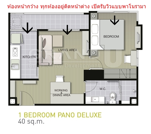 แปลนห้อง Pano Deluxe ในคอนโด "ยู ดีไลท์ เรสซิเดนซ์ พัฒนาการ-ทองหล่อ" (U-Delight Residence) มีจุดเด่นอยู่ที่รูปแบบแปลนห้องหน้ากว้างโดยมีขนาดห้องเริ่มต้นที่ 35 ตร.ม. ไปจนถึง 40 ตร.ม. ห้องหน้ากว้างนี้ได้ออกแบบให้ห้องนั่งเล่น ห้องครัว และห้องนอน อยู่ติดหน้าต่างของห้องสามารถรับชมวิวในมุมมองพาโนรามาได้อย่างเต็มตา