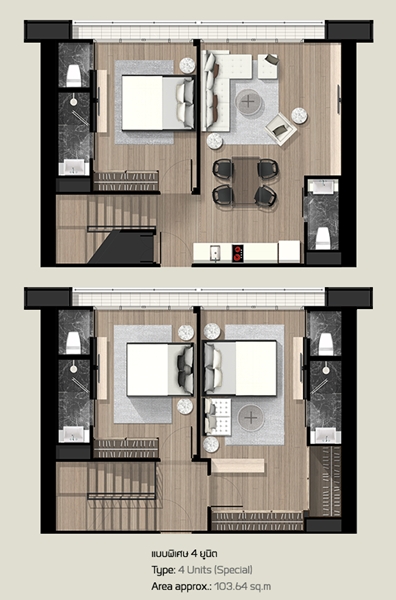 แปลนห้องแบบพิเศษควบ 4 ยูนิตของโครงการ "พาร์ค 24" (Park 24) นี้เป็นแบบ Duplex ที่มีถึง 3 ห้องนอน 4 ห้องน้ำ โดยเป็นการรวม 4 ยูนิตเล็กๆ ทั้งหมดเข้ามาเป็น 1 ยูนิต Duplex ใหญ่ ถือว่าน่าสนใจไม่น้อยสำหรับครอบครัวที่อยู่คอนโด 3-4 คนในยูนิตเดียว และแต่ละคนก็สามารถมีห้องส่วนตัวของตัวเองได้ นอกจากนี้ โครงการนี้ก็ยังมีขายแบบ 2 ยูนิตเล็กรวมกันเข้าเป็น 1 ยูนิตใหญ่เพื่อให้ได้ 2 ห้องนอนด้วยโดยจะได้ 2 โฉนดแยกจากกันเป็น 2 ยูนิตเพื่อแบ่งขายต่อได้ในอนาคต