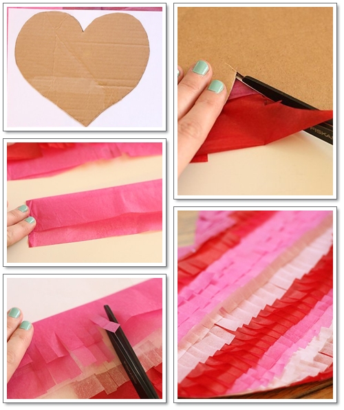 วาดรูปหัวใจลงบนชิ้นส่วนของกระดาษลัง ติดเทปกาว 2 หน้าลงบนกระดาษลังที่ตัดเป็นรูปหัวใจแล้ว ตัดกระดาษทิชชูสีๆ สูงประมาณ 4 นิ้ว ความยาวเท่ากับขนาดความกว้างของหัวใจ โดยพับทิชชูลงมากึ่งหนึงประมาณ 3:4 แล้วแปะลงบนหัวใจที่มีเทปกาวติดอยู่ก่อนหน้านี้ ค่อยๆ ตัดทิชชูจากด้านล่างของหัวใจขึ้นไปทีละชั้นให้เป็นริ้วโดยมีความกว้างประมาณ 1 นิ้วเท่าๆ กัน จากนั้นหาภาพประจำตัวของคุณกับหวานใจมาขนาบข้างหัวใจทิชชูของคุณเพื่อให้ดู มีสีสันมากขึ้น หรือจะเป็นรูปถ่ายแต่งโฟโต้ช็อปออกแนวอาร์ตๆ ก็เก๋ดีนะคะ เก็บรายละเอียดส่วนเกินนอกหัวใจให้เรียบร้อยก็เสร็จสมบูรณ์