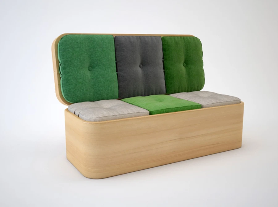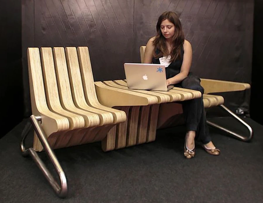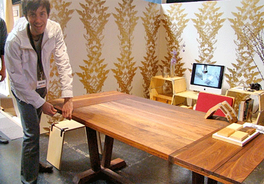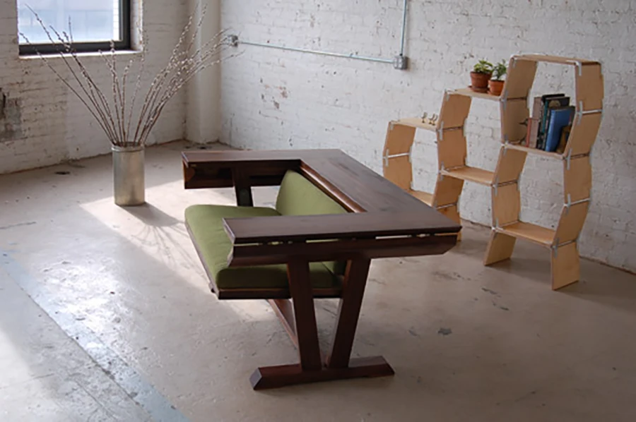 โต๊ะลายไม้ Walnut ตัวนี้เป็นทั้งโต๊ะ และโซฟา Loveseat เบาะจะซ่อนอยู่ใต้โต๊ะ พอเปิดแล้วดัน จากโต๊ะจะกลายเป็นโซฟาในทันที (ออกแบบโดย Ecosystems)