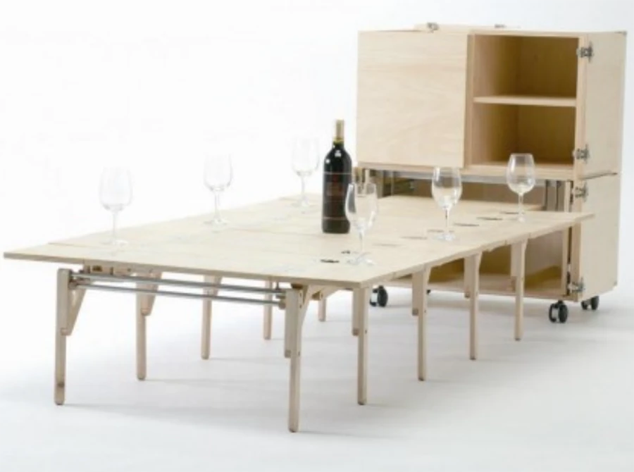 ตู้ชุดนี้สามารถเปิดแล้ว และดึงออกมาเป็นโต๊ะที่สามารถรองรับคนได้ 2-8 คน เหมาะมากๆ สำหรับห้องพื้นที่น้อยๆ (ออกแบบโดย Nobuhiro Teshima)