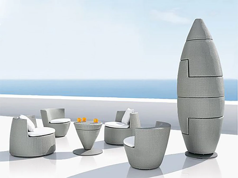 เฟอร์นิเจอร์ Outdoor ชุดนี้ประกอบไปด้วยเก้าอี้ 4 ตัว และโต๊ะ 1 ตัว เมื่อไม่ต้องการใช้ก็สามารถวางเก็บเข้าชุดเป็นอนุสาวรีย์แท่งหินมียอดเหมือนปิระมิดได้เลย (Obelisk)