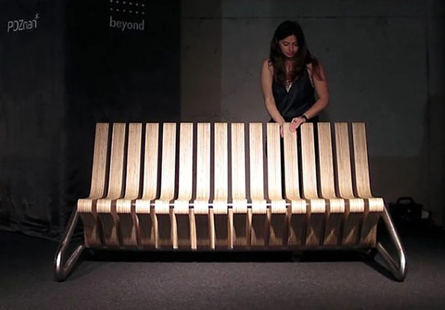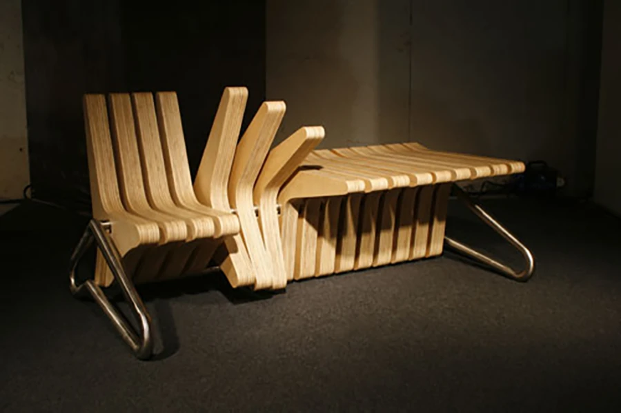 ม้านั่งตัวนี้เป็นได้หลากหลายมาก แค่หมุนชิ้นที่นั่งไปมา ก็จะได้ทั้งม้านั่งยาว ม้านั่งสองที่นั่งพร้อมโต๊ะข้าง หรือม้านั่งสองที่นั่งพร้อมโต๊ะกลาง เป็นได้ทุกอย่างสมบูรณ์แบบเลย (ออกแบบโดย Beyond Standards)