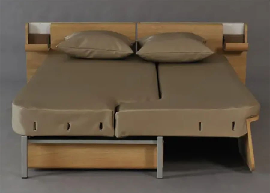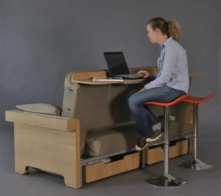 เฟอร์นิเจอร์ชุดนี้เป็นได้ทั้งโต๊ะทำงานแบบ Workstation เล็กๆ เป็นโซฟา และก็เป็นเตียงนอนได้ เหมาะกับห้องนั่งเล่นในบ้าน หรือคอนโดเล็กๆ เพราะสามารถปรับเป็นที่นอนได้เลยสำหรับแขกที่มาเยี่ยม (ออกแบบโดย Fanny Adams)